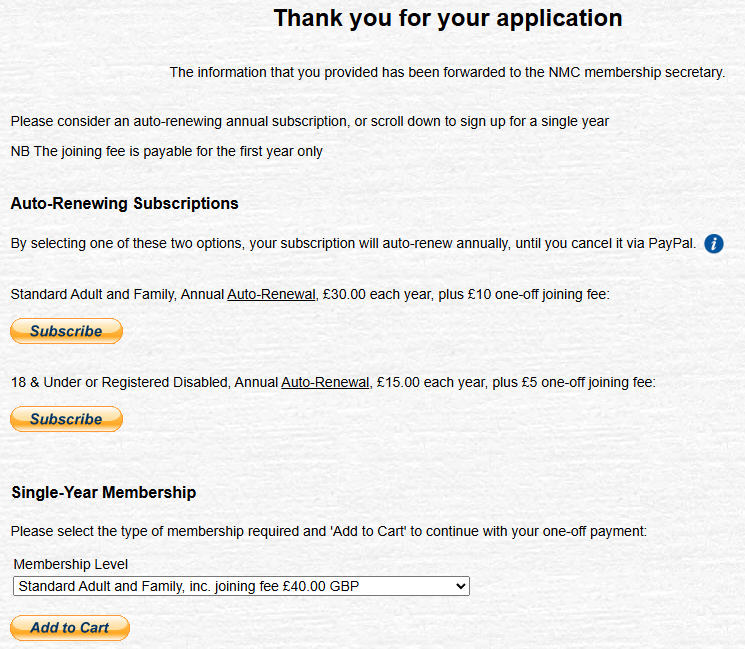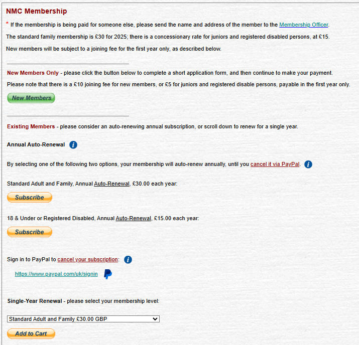 From June 2024 onwards, for existing members and also new applicants, it is now possible to set up an auto-renewal, although the option for a single-year payment is still available. The PayPal components of the process also allow a payment by credit card for those applicants who do not have a pre-existing PayPal account. The subsequent annual auto-renewal is on a specific date, not 'start of month' / 'end of month'; a subscription taken out on (say) 23rd June will auto-renew each year on or about that date, subject to PayPal's own internal processes. Sign-up is via the NMC Shop page; cancellation remains within the direct control of the applicant, via PayPal. Existing Members:(scroll further down for a description of the 'New Members' process)