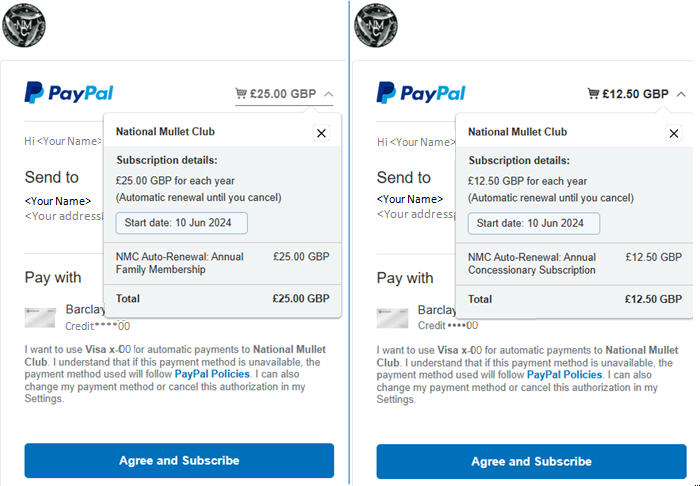 On clicking one of the 'Subscribe' buttons, the PayPal process is then as defined above for existing members' renewals.
