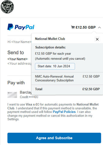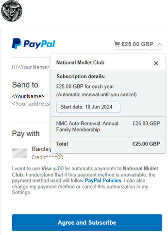 The applicant can exit here to cancel, and no payment will be collected. If they proceed, they will receive an email confirming their subscription. A further email is received when each future payment is collected. New Members:After clicking the 'New Members' button in the NMC Shop page and then supplying contact details, new applicants are presented with the following revised payment options. An 'info' button is provided so that potential auto-renewing subscribers can view the PayPal help page regarding future cancellation.